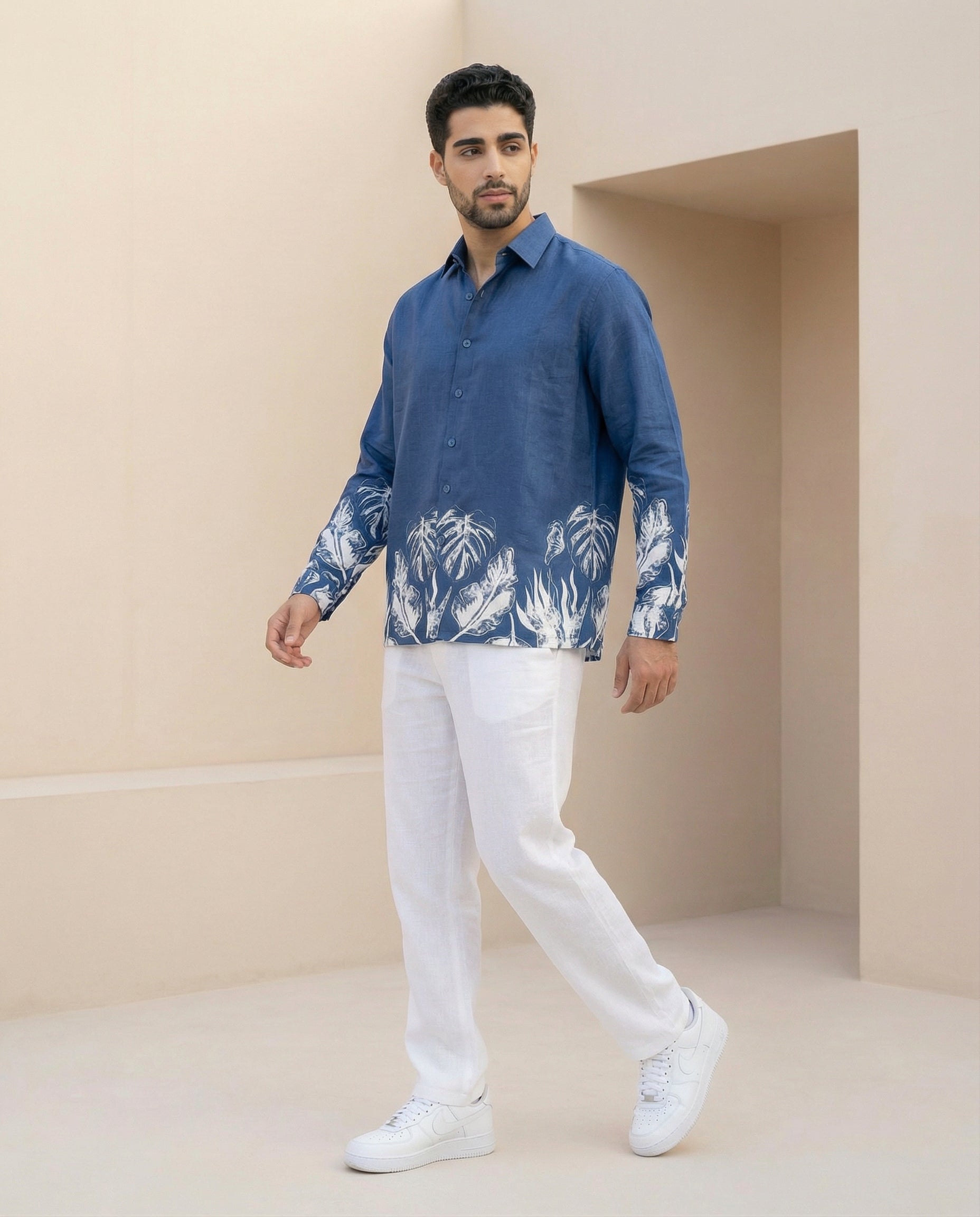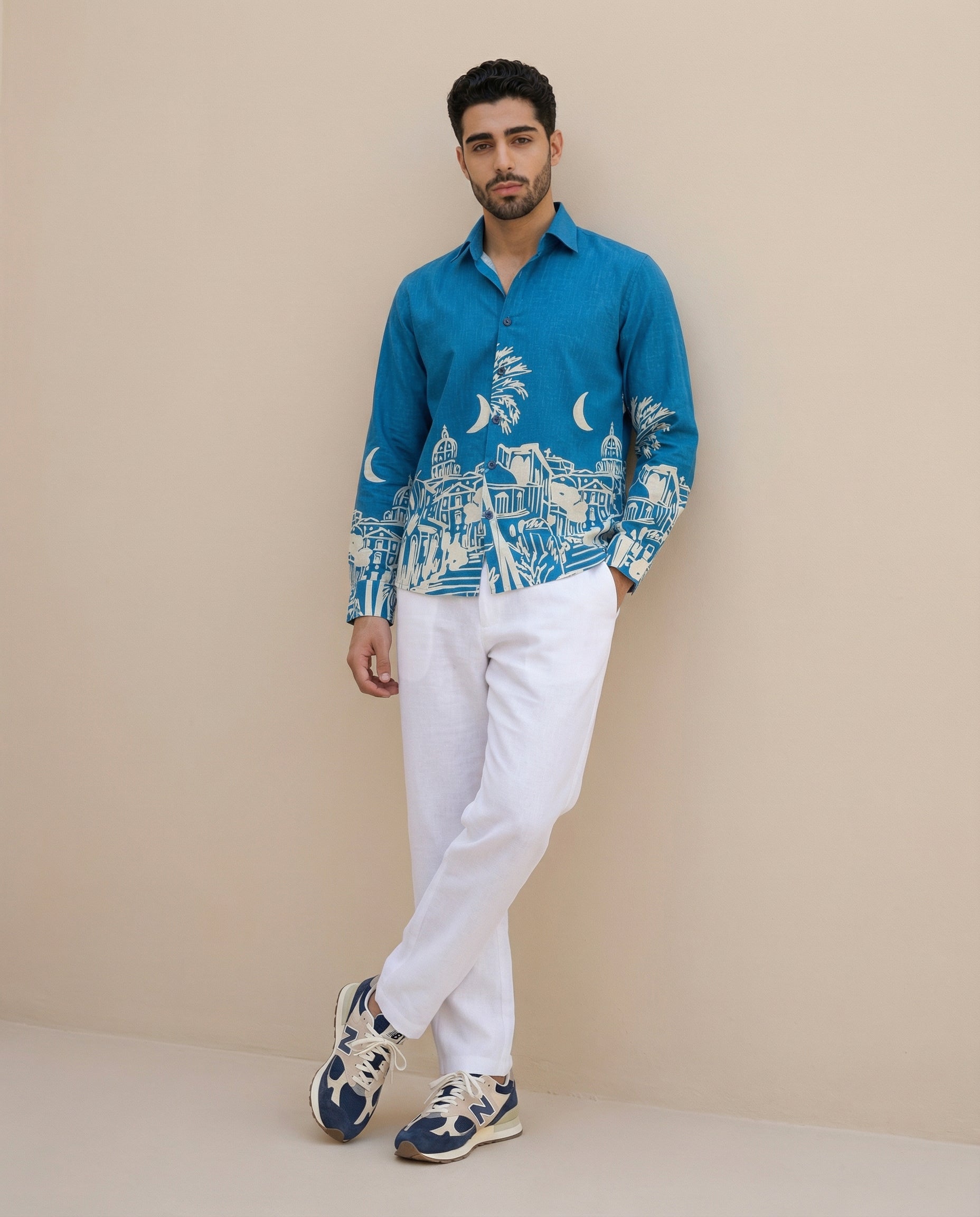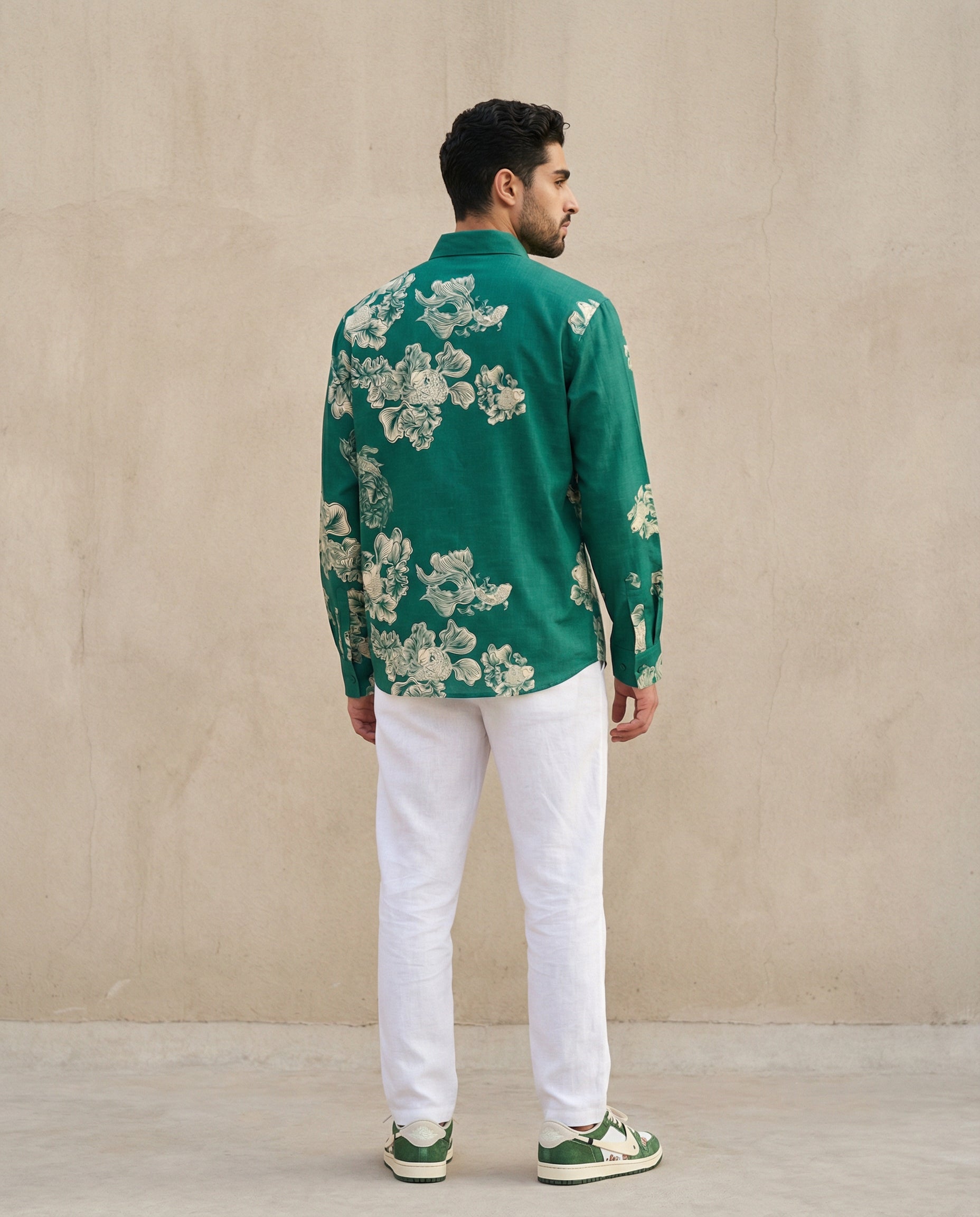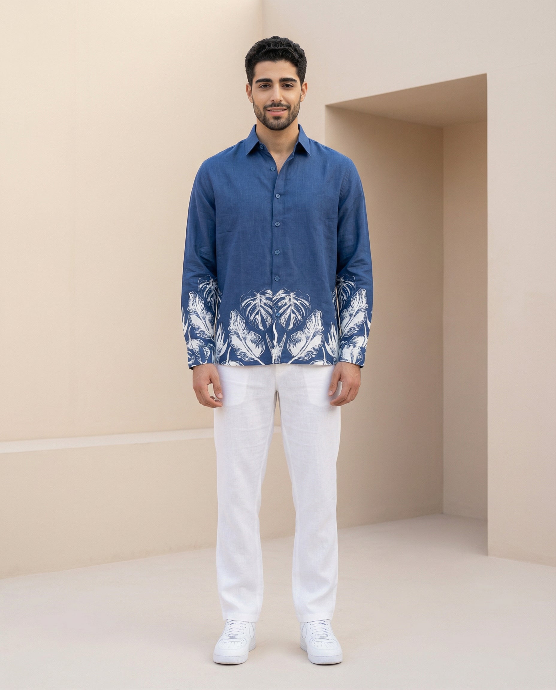 100% cambric cotton button-up featuring intricate cream-colored botanical prints on a vibrant turquoise background. The lightweight, breathable fabric offers exceptional summer comfort while the detailed floral pattern with stylized lilies creates an elegant yet relaxed tropical aesthetic.