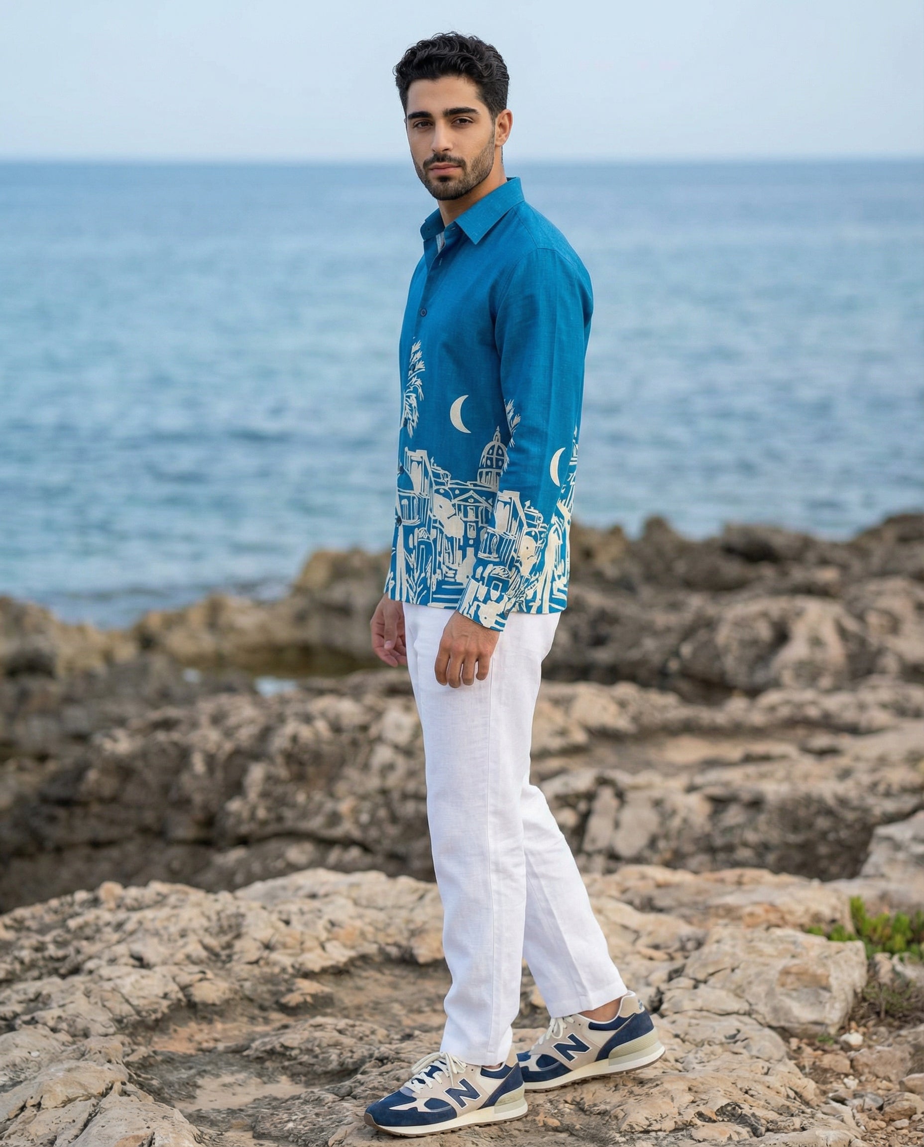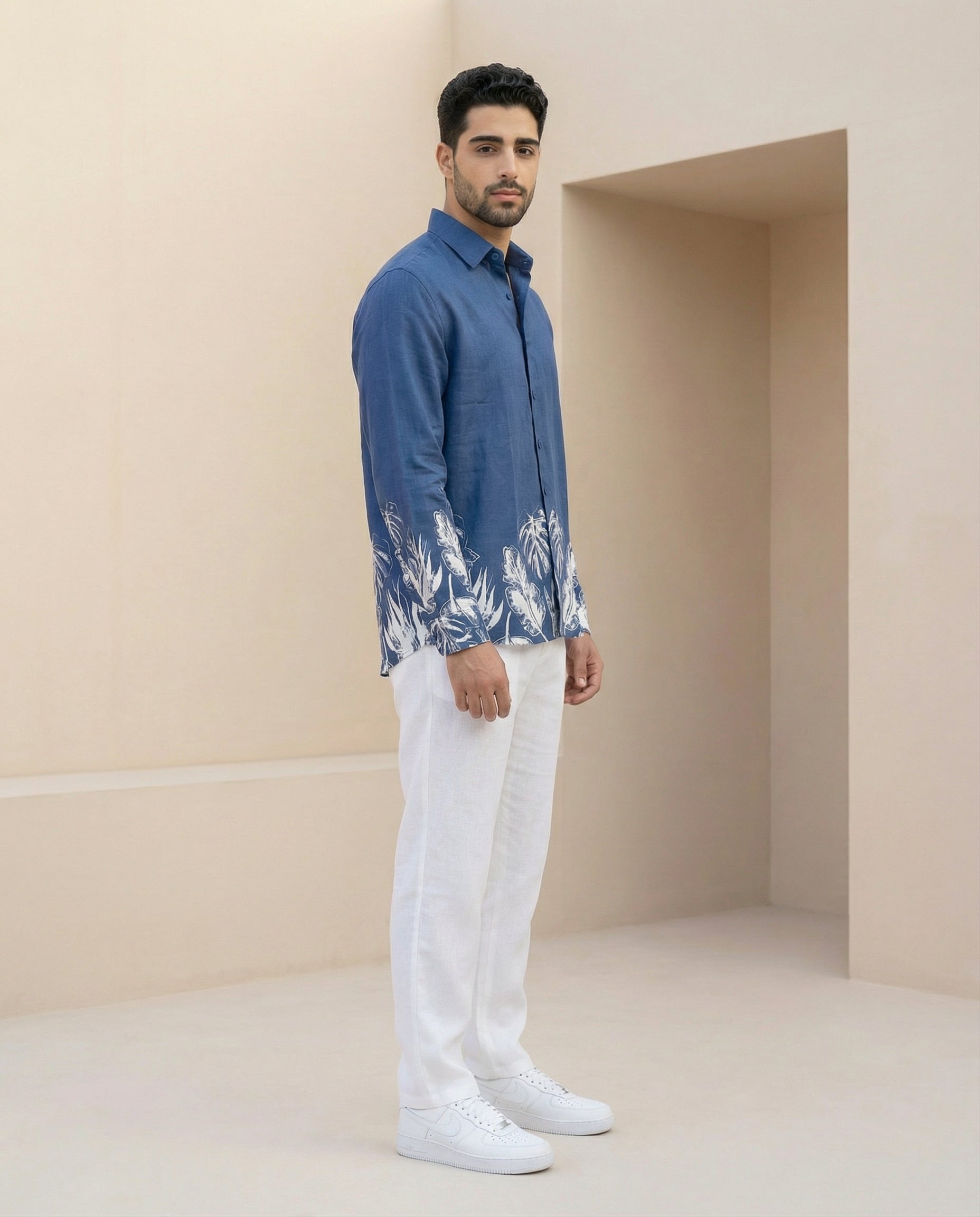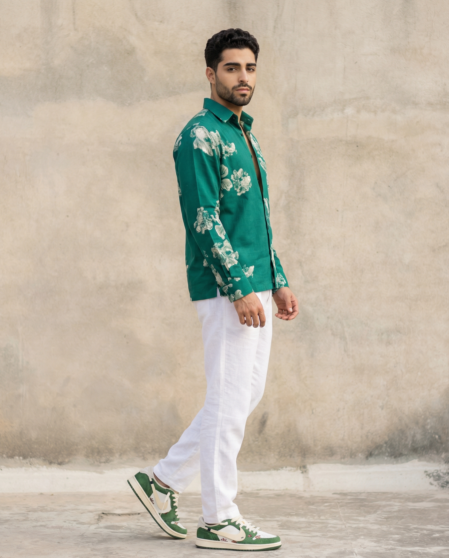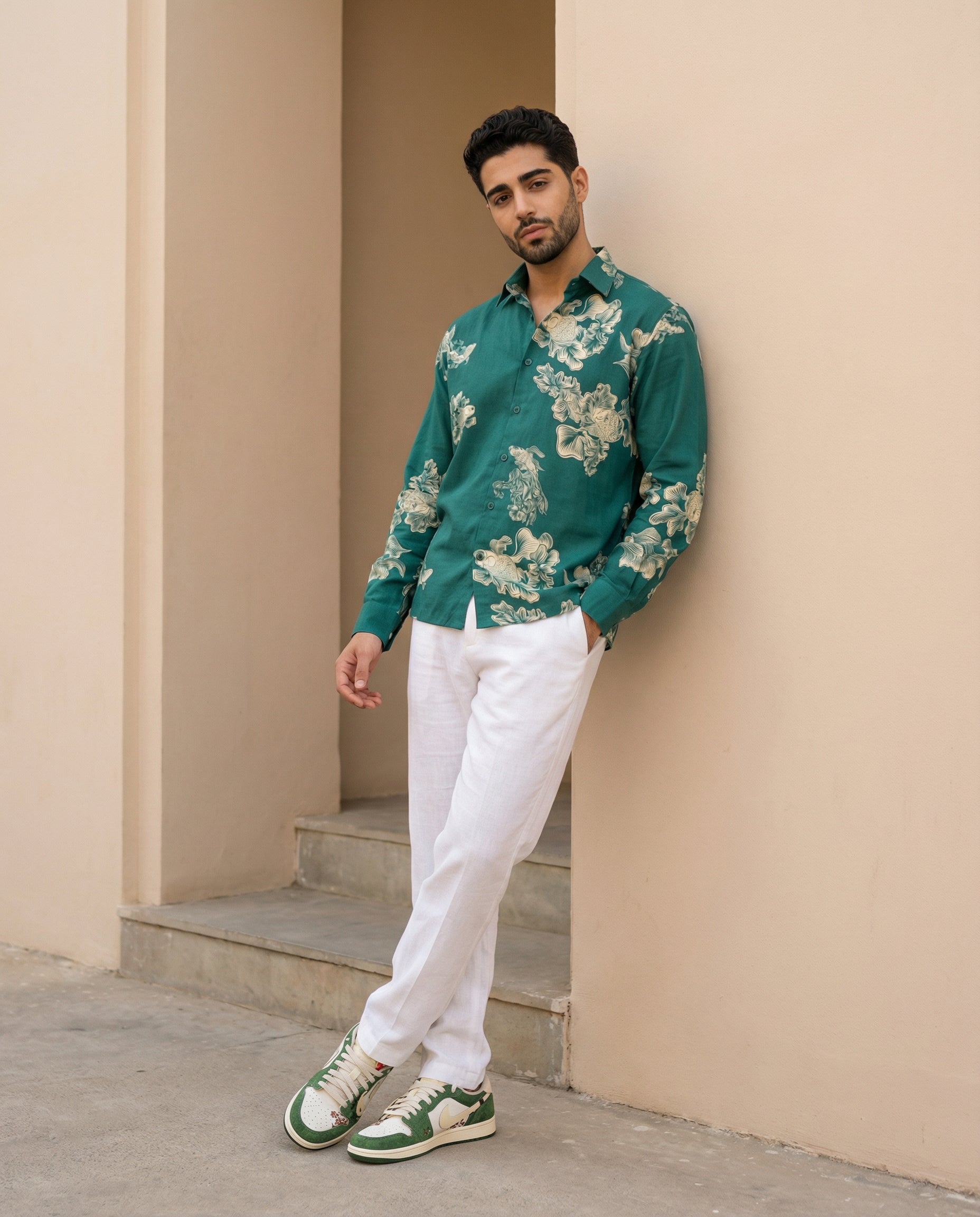 100% cambric cotton button-up featuring intricate cream-colored botanical prints on a vibrant turquoise background. The lightweight, breathable fabric offers exceptional summer comfort while the detailed floral pattern with stylized lilies creates an elegant yet relaxed tropical aesthetic.