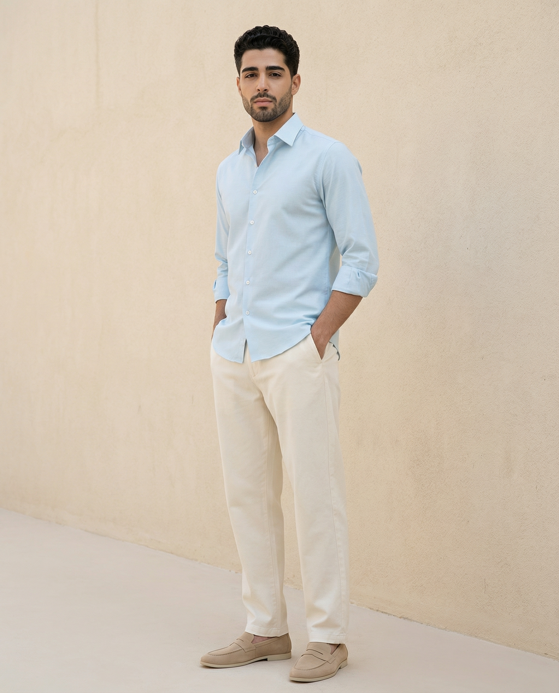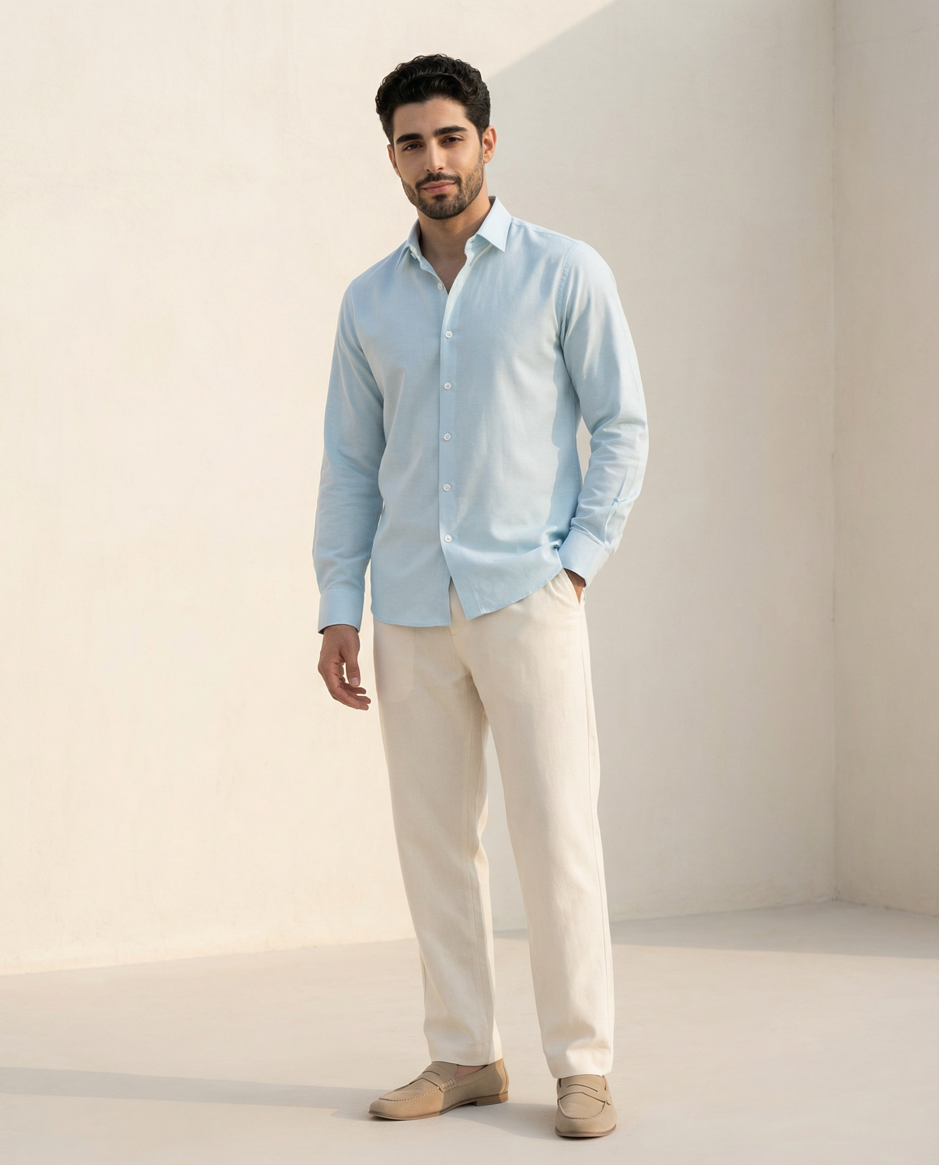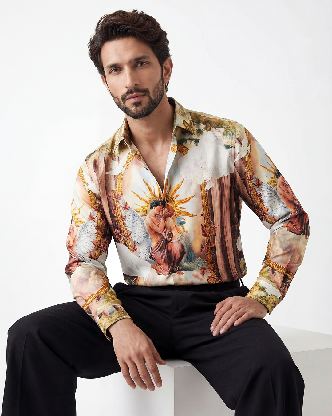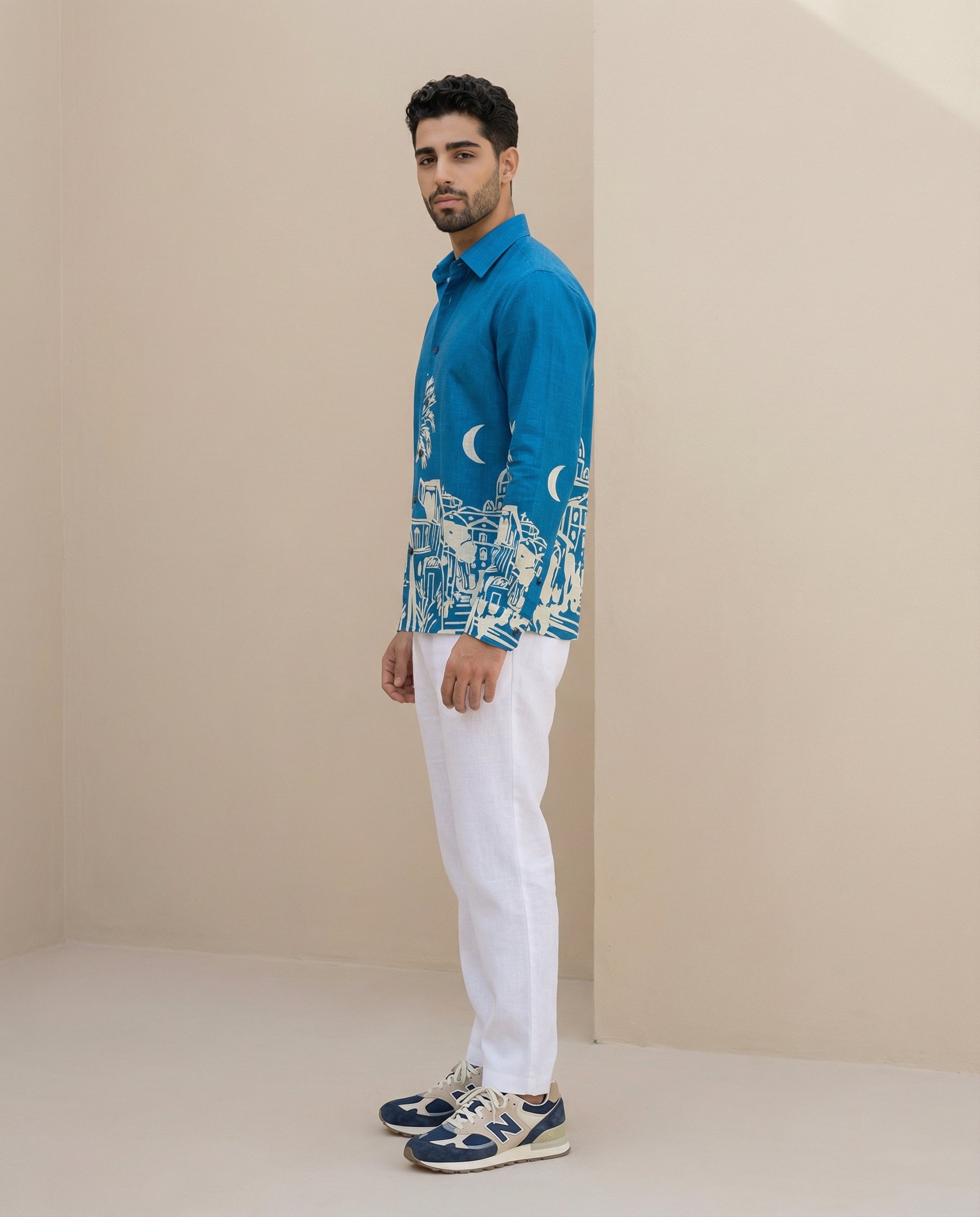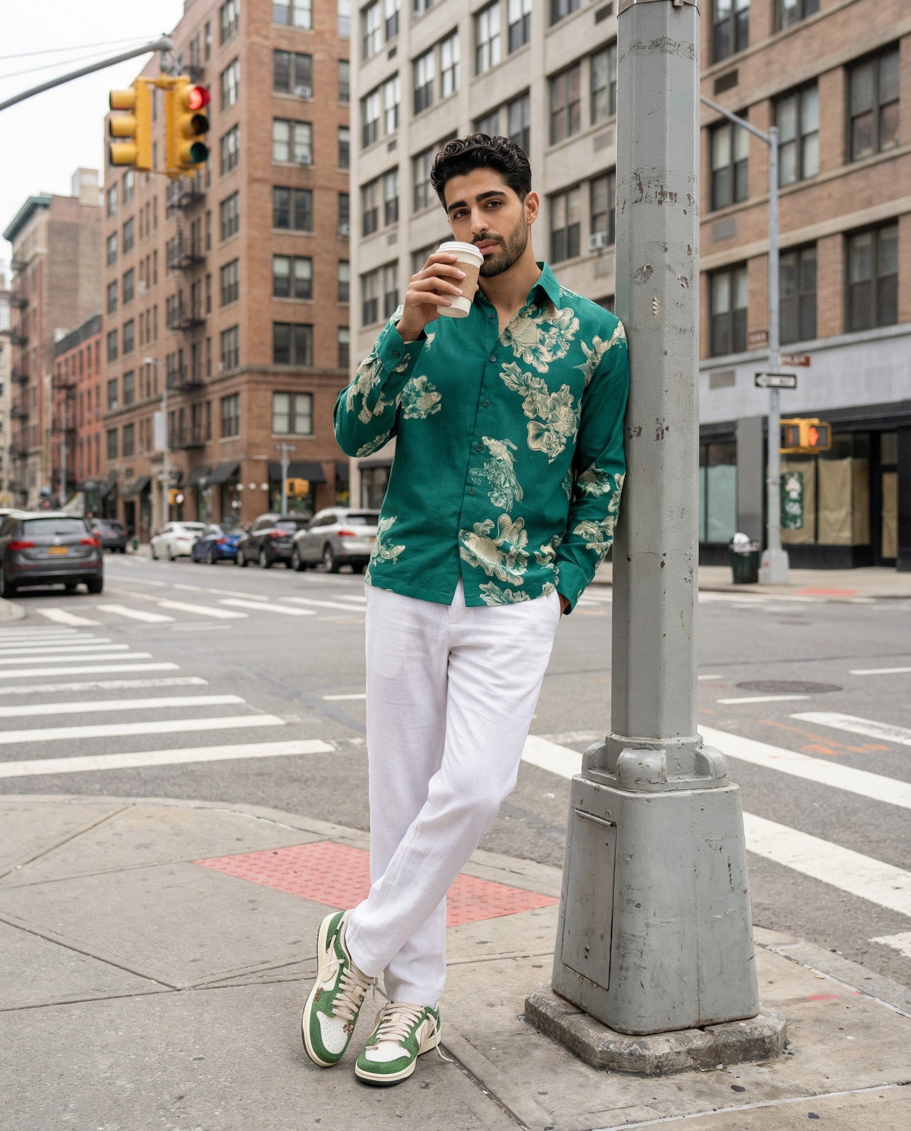 100% cambric cotton button-up featuring intricate cream-colored botanical prints on a vibrant turquoise background. The lightweight, breathable fabric offers exceptional summer comfort while the detailed floral pattern with stylized lilies creates an elegant yet relaxed tropical aesthetic.