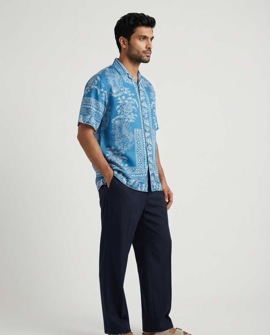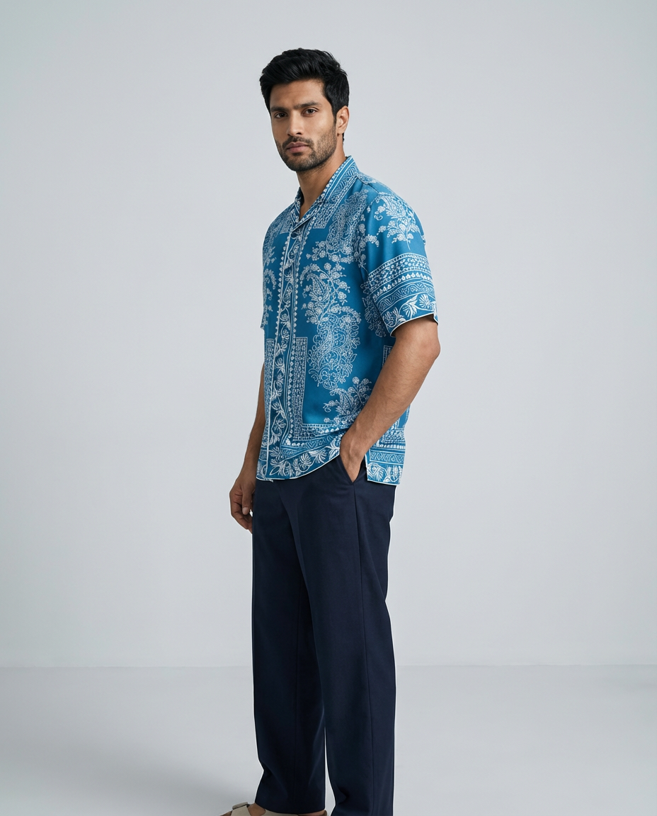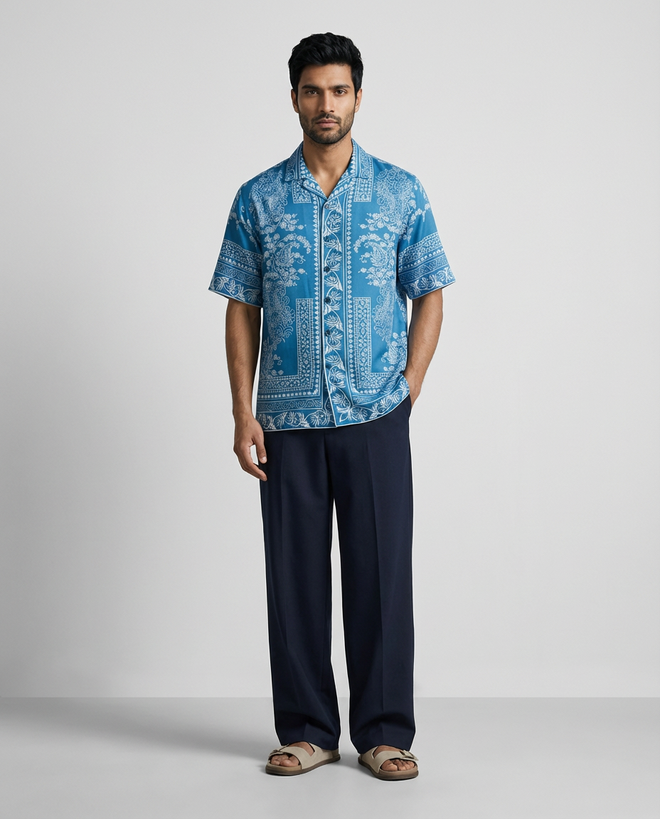 Step out in style with this Cuban collar shirt, tailored from ultra-soft, breathable tencel fabric. Featuring relaxed tailoring and an artistic abstract print in deep reds, blues, and muted tones, it offers a fluid drape and contemporary flair—perfect for standout summer statements.